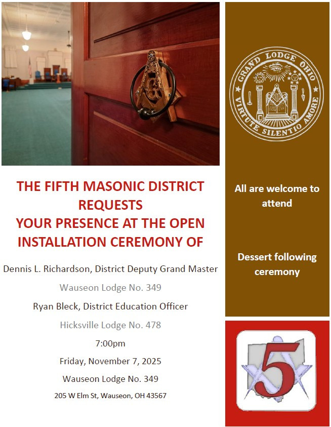 - 12/6: 5th District Past Masters Convocation at Wauseon @ 9a, Reg @ 8a